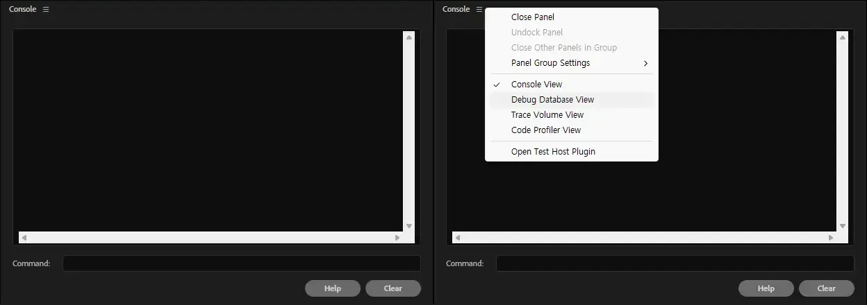 Ctrl+F12눌러서 콘솔(Console)창 띄운 후 메뉴 → 클릭 Debug Database View클릭